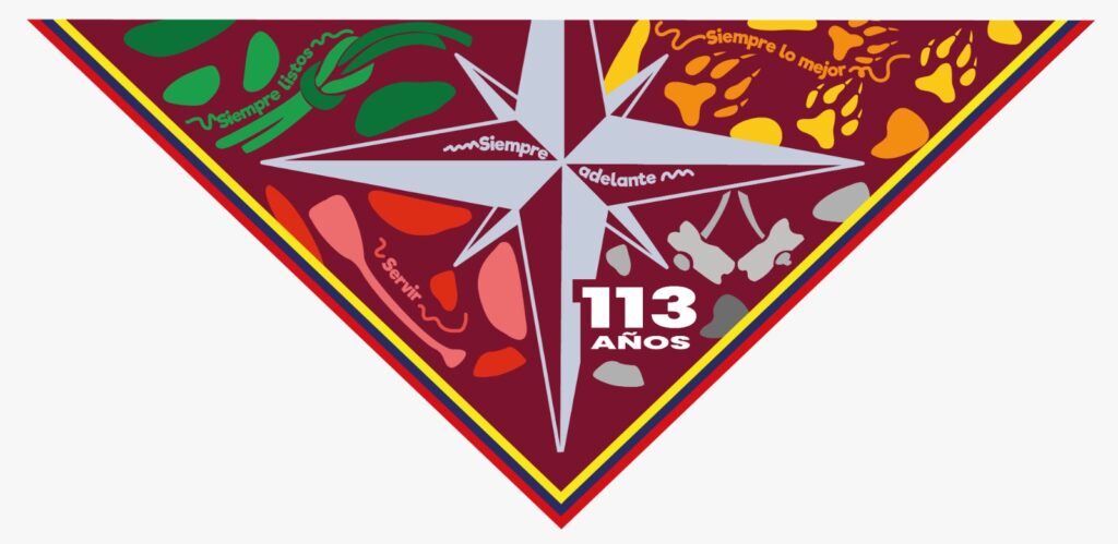 Este diseño de Insignia y Pañoleta busca representar la esencia y la identidad de cada una de las ramas de nuestro Proyecto Educativo, incorporando además la nueva Rama de Comunidad de Caminantes, como símbolo de bienvenida a esta sección recientemente incorporada dentro del escultismo en Venezuela que se encuentran en cada lado de la brújula: